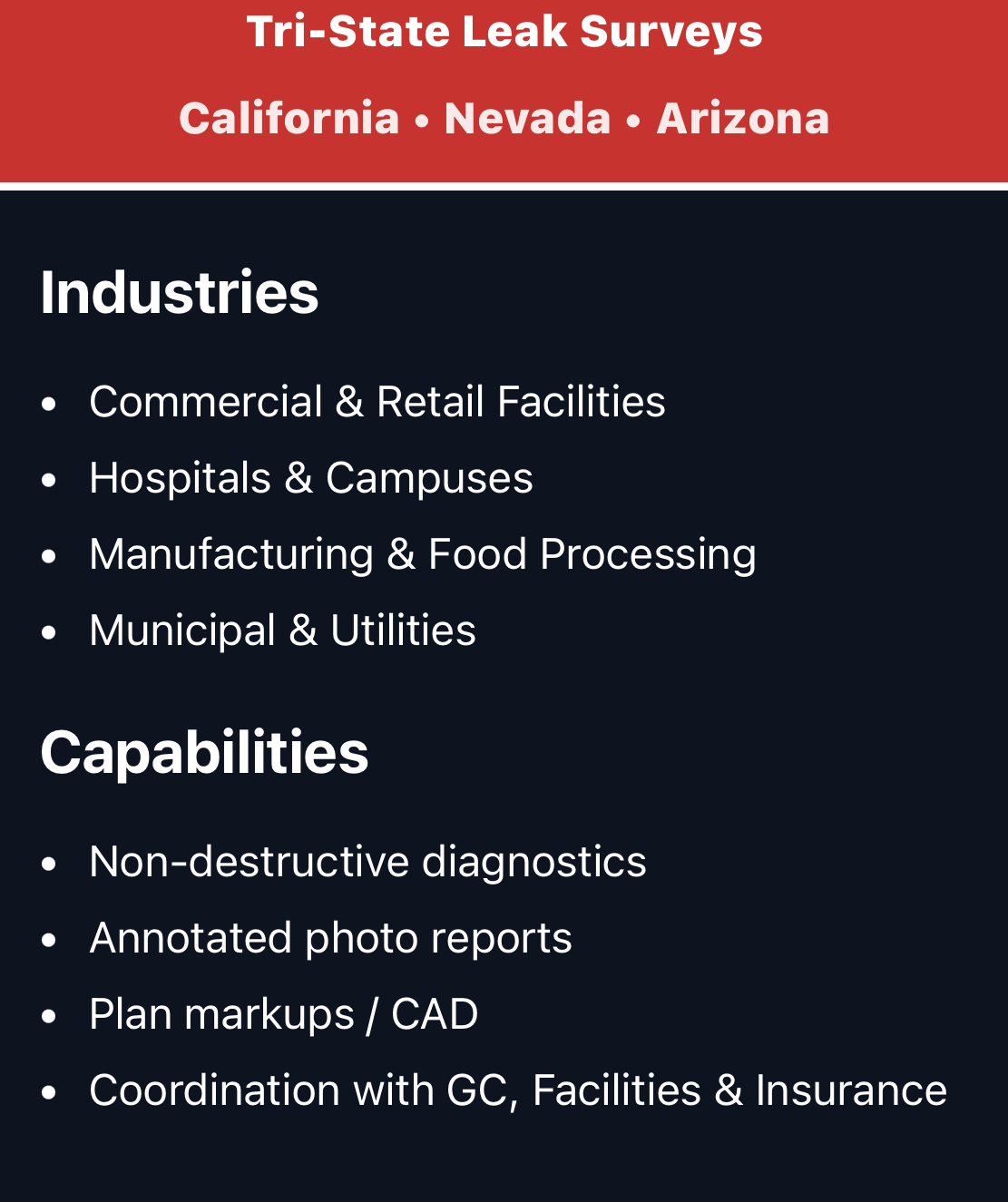 tility Locators San Bernardino,Riverside,Los Angeles,Orange,San Diego,Ventura CountShear Wall Inspections. Utility Locators San Bernardino,Riverside,Los Angeles,Orange,San Diego,Ventura  Concrete IDeputy Inspection Service. Call Now! Friendly & Personable · Last Minute Scheduling · 24 Hour Text & Call · Competitive Pricing Seox.  Private Utility Locating When Needed: For private lines and systems not covered by the service, including: Irrigation systems  Parking lot lighting  SecurUtility and fire control systems  Storage tanks  Process sewers  How it Works: Private locators use advanced technologies: Electromagnetic Locators: These use transmitters and receivers to detect signals on conductive lines.  Ground Penetrating Radar (GPR): A non-invasive tool that uses radar waves to map underground ities and structures.  Prevent costly damage, project delays, and safety risks associated with hitting private lines.  Utility Marking Colors  Once located, underground ities are marked using universal spray paint colors to identify their type. Red: Electrical, conduit, lighting Orange: Telecommunications, TV, alarm, signal Yellow: Gas, oil, steam, petroleum Green: Sewer, storm drain Blue: Potable water Purple: Reclaimed water, irrigation Pink: Temporary marking White: Proposed excavation Utility location - Wikipedia Utility color codes are used to identify existing underground ities in construction areas, to protect them from damage during ... Wikipedia How Utility Locators Work as their cathotic protection for corrosion. not used as often. but these are some of the passive modes that we have an... Private Utility Locating Services - Comprehensive Damage Prevention. The law requires that you prior to digging to have underground ities marked. However... Show all Show more Businesses Buon Utility Locating 5.0(3) · Utility contractor San Juan Capistrano, CA Open 24 hours · "He even provided a detailed map of my ities for future reference." Website Route SoCal Locators y contractor 3+ years in business "They are our go-to team for private Utility locating." Website Enhanced Scanning (Utility Locating)· Utility contractor 5+ years in business Closed Website More businesses Open in Maps People also ask What is the meaning of Utility locator? What is the highest pay for a Utility locator? How much does a private Utility locate cost? How do Utility locates work? Feedback Superior Underground Utility Locating & Mapping Ground Penetrating Radar Systems  › services › Utility-locating-s... Superior provides comprehensive digital and PDF Utility maps of every Utility on site, whether public or private – including depths. Utility location wiki › Utility_location Utility locating is the process of identifying and labeling public Utility mains that are underground. These mains may include lines for telecommunication, ... Find related products & services GPR locating equipment Underground Utility locator near me Water line locator service near me Utility locators for sale Residential Utility locator near me Private Utility locating cost These searches help you find relevant offers from adveisers Superior : Underground Utility Location and Damage Prevention Superior www.Superiorutilitylocators .com Superior locates and marks these Utility lines to prevent damage and service disruptions and keep excavators and our communities safe. Careers Public Utility Locating Private Utility Locating Services Underground Utility Locating: How it Works & Common ... 4M  › blog › overview-under... Oct 11, 2023 — In this aicle, we'll look at common methods of underground Utility locating, how they work, and why they're so impoant. Utility Locators - Products Electronics › Products Subsite offers a comprehensive line of Utility locators and beacons that deliver Underground Awareness. With innovative features and cutting-edge accuracy. Private Utility Locating Services -  › services › private-Utility-locating locates all underground ities and structures, including those which are privately owned and not required to be marked by . Utility Locating Service & Underground Utility Locator Locate Private Utility Locators offering Underground Locating and Mapping Services in all Arizona and Southern California counties. Call (888) Contact Us Trusted Utility Locating Service... Utility Mapping Careers How Underground Utility Locating Works Ground Penetrating Radar Systems  › Industry Insights Utility locating involves izing technology such as ground penetrating radar (GPR) and electromagnetic (EM) locating to detect and map power, gas, water, ... Private Underground Utility Locator Services, Wires & Line Company  › private-Utility-locating Penhall Technologies, a leader among Utility locator companies, provides comprehensive private Utility locating services for construction and demolition  Digital Concrete Scanning Digital Concrete Scanning Digital Concrete Scanning Digital Concrete Scanning Digital Concrete Scanning Digital Concrete Scanning Digital Concrete Scanning Digital Concrete Scanning Digital Concrete Scanning Digital Concrete Scanning Digital Concrete Scanning Digital Concrete Scanning Digital Concrete Scanning Digital Concrete Scanning Digital Concrete Scanning Digital Concrete Scanning Digital Concrete Scanning Digital Concrete Scanning Digital Concrete Scanning Digital Concrete Scanning Digital Concrete Scanning Digital Concrete Scanning Digital Concrete Scanning Digital Concrete Scanning Digital Concrete Scanning Digital Concrete Scanning Digital Concrete Scanning Digital Concrete Scanning Digital Concrete Scanning Digital Concrete Scanning Digital Concrete Scanning Digital Concrete Scanning Digital Concrete Scanning Digital Concrete Scanning Digital Concrete Scanning Digital Concrete Scanning Digital Concrete Scanning Digital Concrete Scanning Digital Concrete Scanning Digital Concrete Scanning Digital Concrete Scanning Digital Concrete Scann